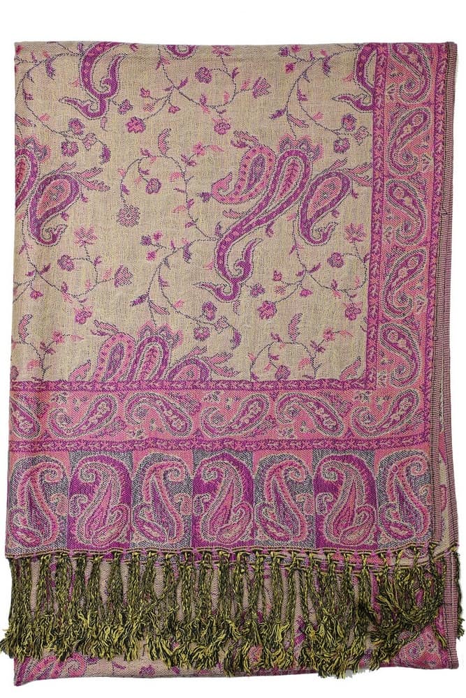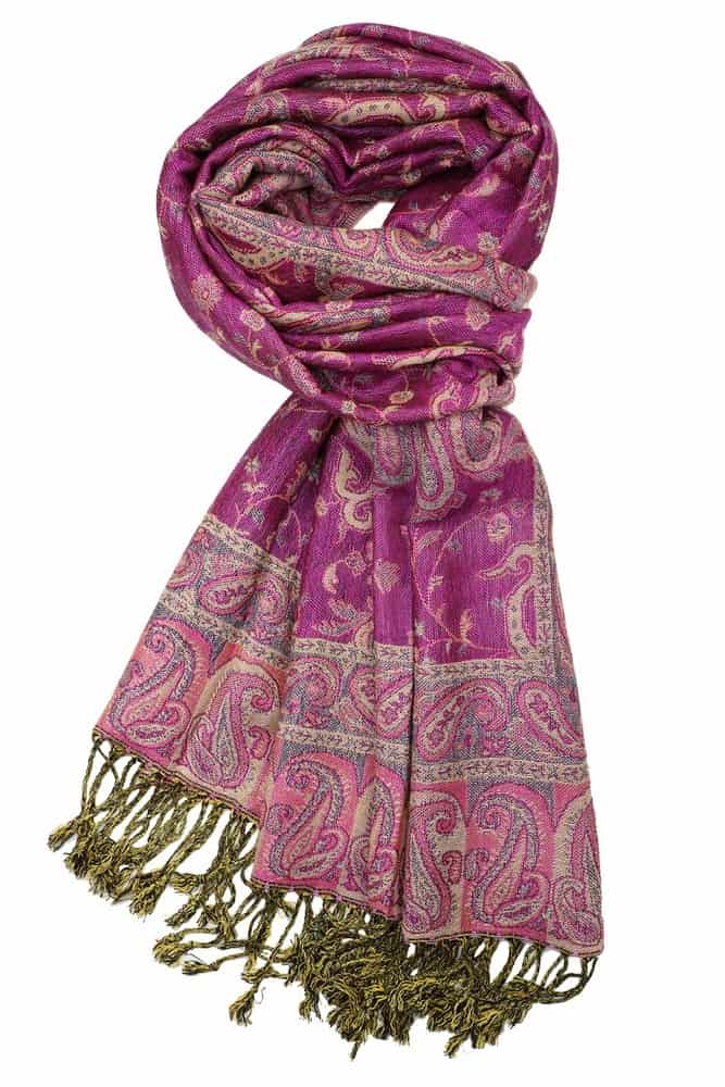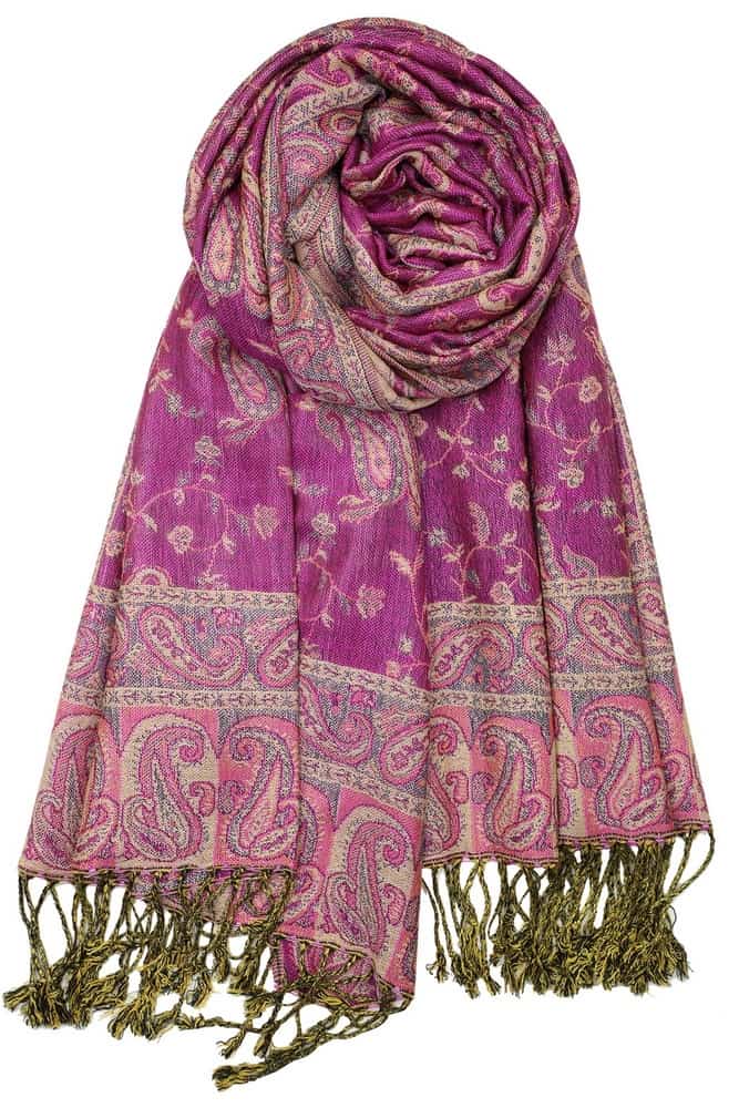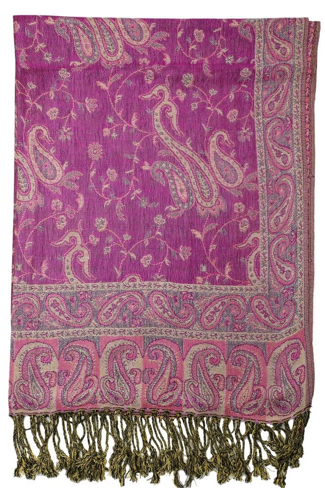 This bright purple reversible paisley pashmina shawl features simple paisley design with a pattern made from flowers and vines. They are quite exotic looking with their many spicy colors. This timeless pashmina scarf is the best way to spice up an ensemble while staying nice and warm.