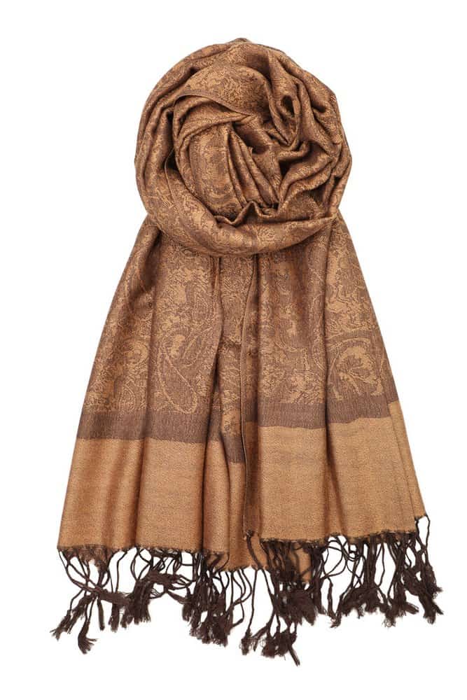 This brown jacquard paisley pashmina features exquisite brocade texture, sophisticated paisley pattern. Vintage paisley pattern is double sided. Each side is made of both colors, but one will be stronger on one side and another on an opposite. Impressive ornate brocade texture. Finely woven to perfection.