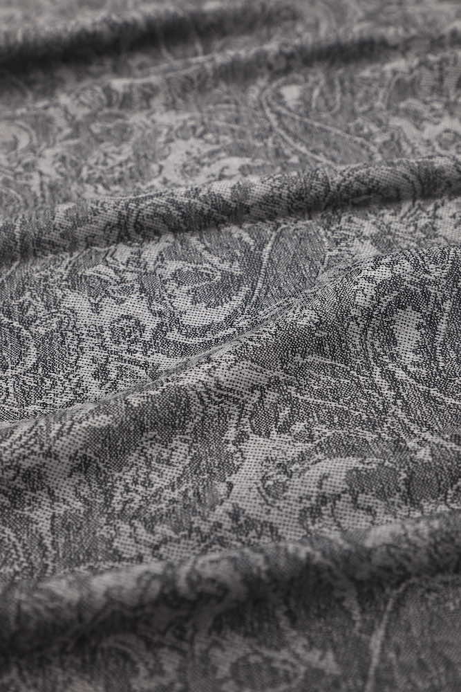 This dark grey jacquard paisley pashmina features exquisite brocade texture, sophisticated paisley pattern. Vintage paisley pattern is double sided. Each side is made of both colors, but one will be stronger on one side and another on an opposite. Impressive ornate brocade texture. Finely woven to perfection.