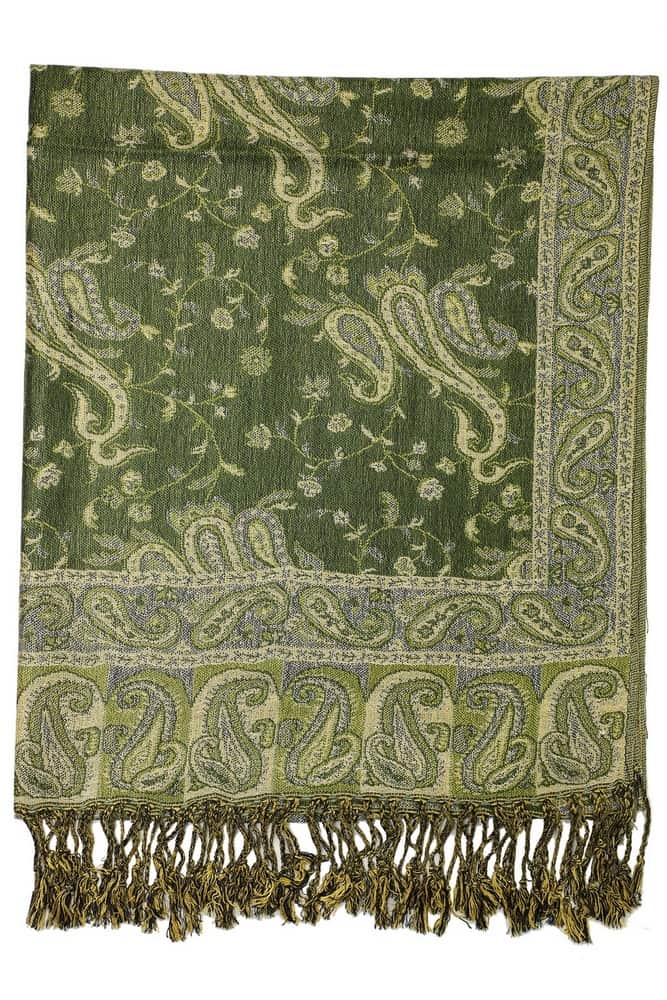 Design is fully reversible. This dark olive reversible paisley pashmina scarf is beautiful and charming for evening wear and great for this time of year. One shawl does it all! These evening pashmina shawls are shiny dressy and elegant for any wedding, special occasion and as a women’s gift. Recommend this to anyone wanting a bit of color and pretty fabric to drape around the neck, it gives a nice feminine touch.