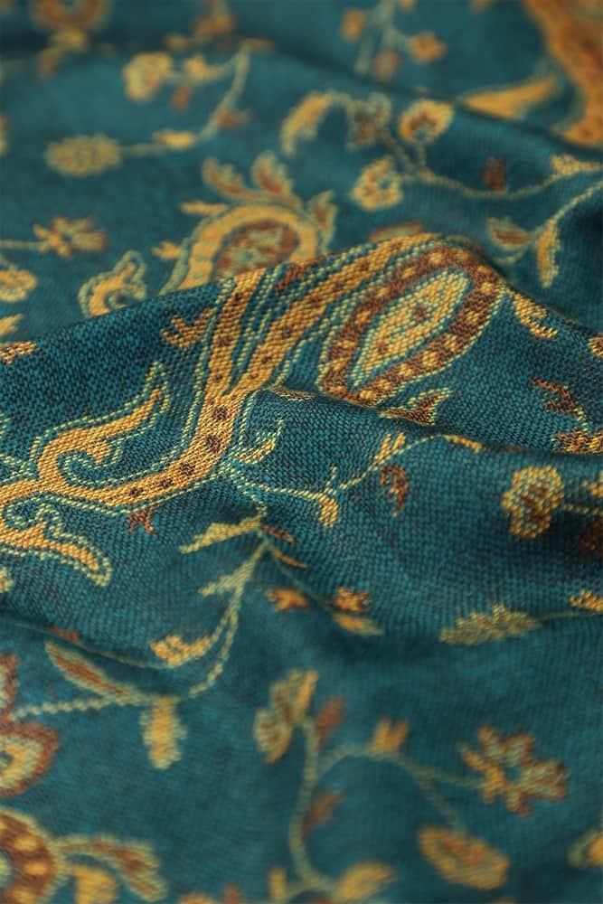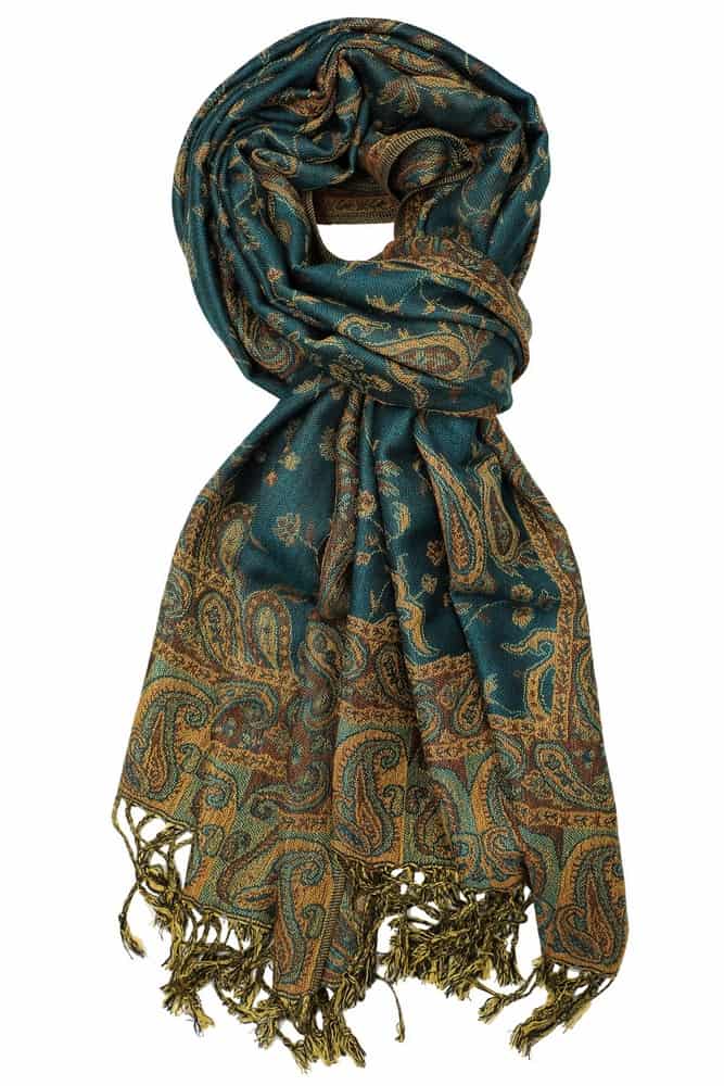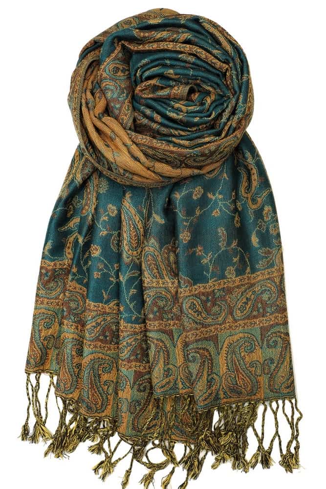 This dark seagreen reversible paisley pashmina shawl features simple paisley design with a pattern made from flowers and vines. They are quite exotic looking with their many spicy colors. This timeless pashmina scarf is the best way to spice up an ensemble while staying nice and warm.