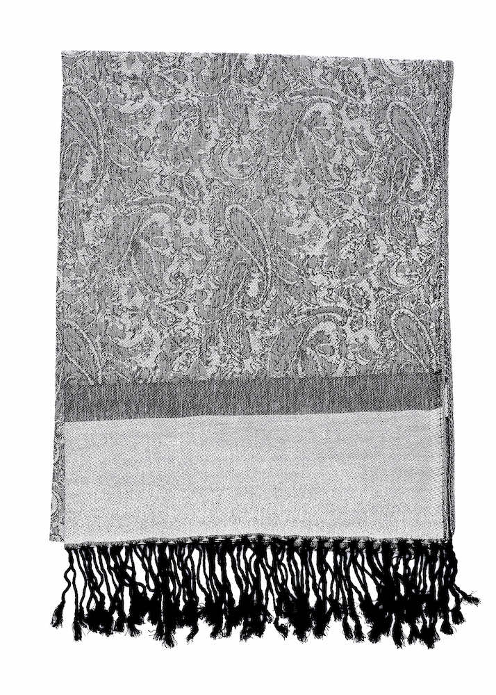 This light grey jacquard paisley pashmina features exquisite brocade texture, sophisticated paisley pattern. Vintage paisley pattern is double sided. Each side is made of both colors, but one will be stronger on one side and another on an opposite. Impressive ornate brocade texture. Finely woven to perfection.