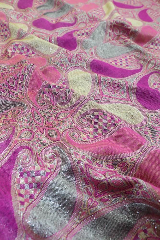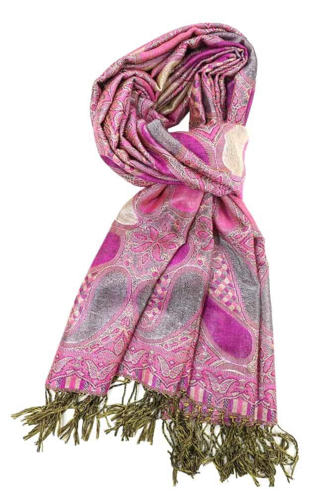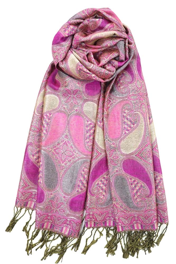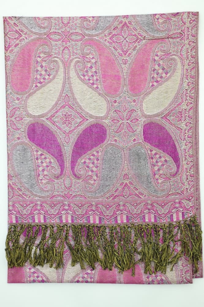 This sparkling orchid metallic pashmina shawl feature metallic thread weave and colorful all paisley pattern. It is soft and luxurious, and the metallic accents give it a rich but not gaudy feel. The slight metallic made it more dressy than a plain shawl.