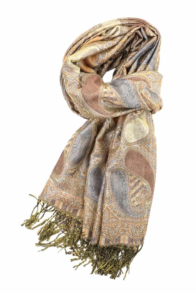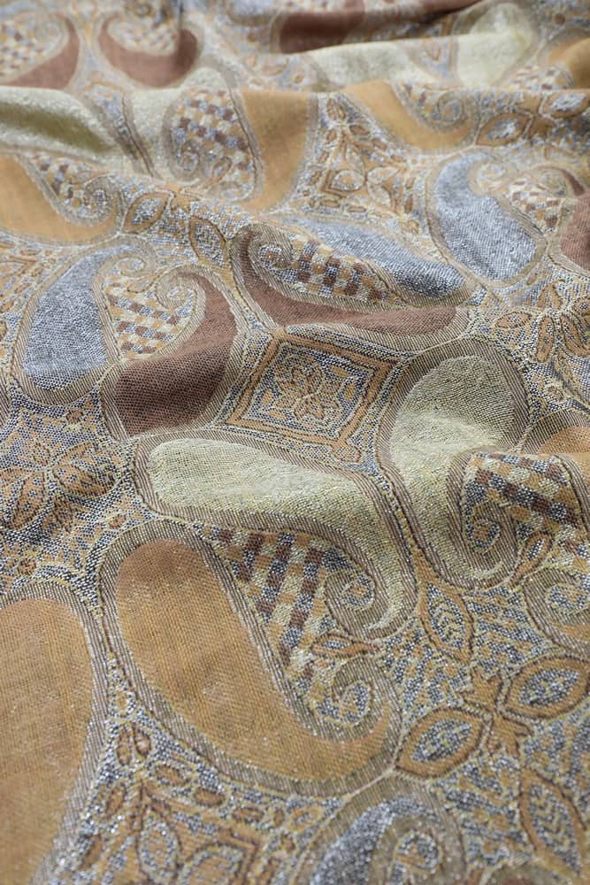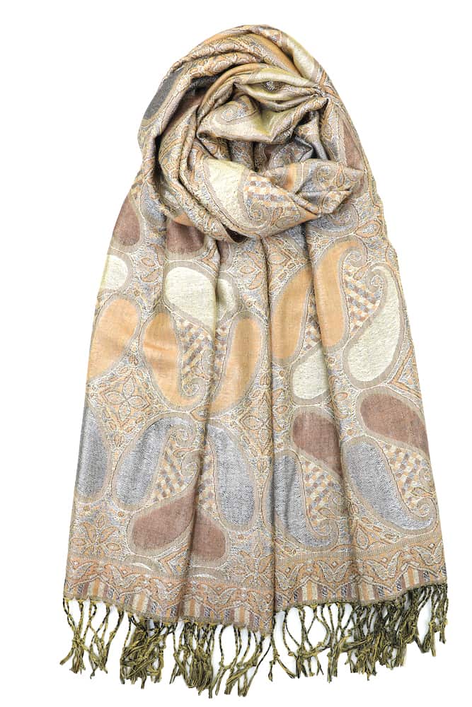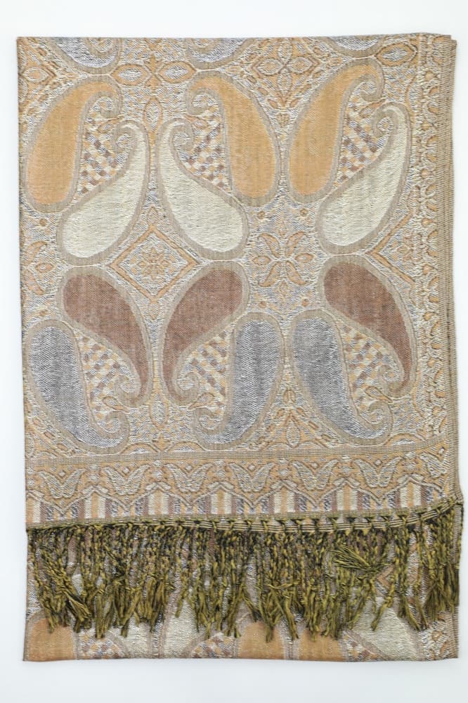 This sparkling tan metallic pashmina scarf feature metallic thread weave and colorful all paisley pattern. It is soft and luxurious, and the metallic accents give it a rich but not gaudy feel. The slight metallic made it more dressy than a plain shawl.